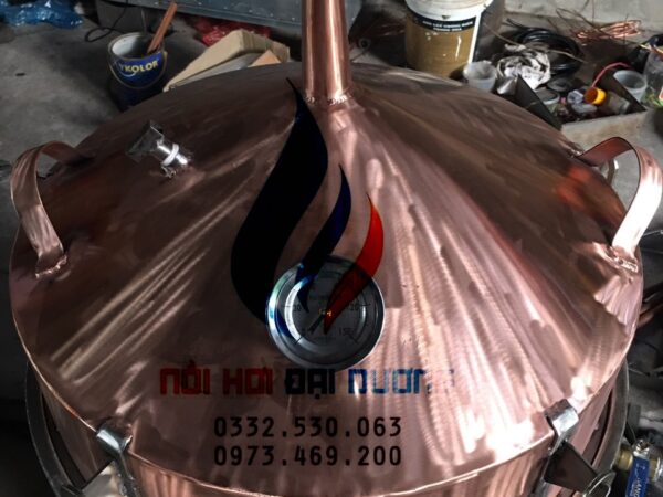 - Khoảng không giữa lớp inox thứ 2 và lớp lõi đồng là khoang giữa chứa dung dịch truyền nhiệt (nước), nồi chưng cất rượu cách thủy, đảm bảo cơm rượu không khê cháy.